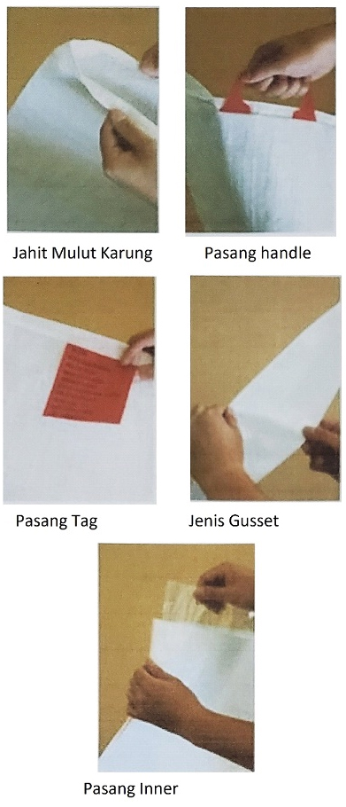 Tipe Karung seperti > Tubular Jahit Bawah > Karung Roll Layar belah tengah > Jahit Mulut Manual Benang / Ultrasonic Sealed > Pemasangan Handle atas > Pemasangan Kode / Tag > Jenis Gusset > Pemasangan Inner beserta Jahit Inner Bawah > Potongan bergelombang > Karung Laminasi, dll.